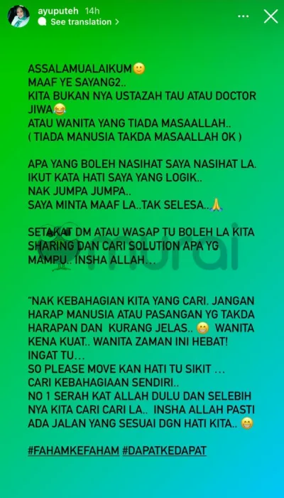 Dalam akhir perkongsian Ayu di Insta-Stories nya, penerbit ini menitip pesan untuk mencari kebahagian diri perkara pertama yang perlu dilakukan adalah, berserah kepada tuhan dan selebihnya berusaha mencari kebahagian yang sesuai dengan diri.