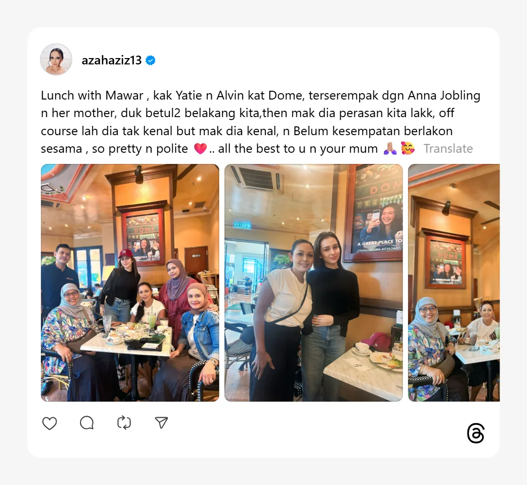 Azah atau nama sebenarnya Norazah Aziz menerusi hantaran di Thread, berkongsi momennya yang terserempak dengan pelakon jelita, Anna Jobling ketika menikmati makan tengah hari di salah sebuah restoran di ibu kota, baru-baru ini.