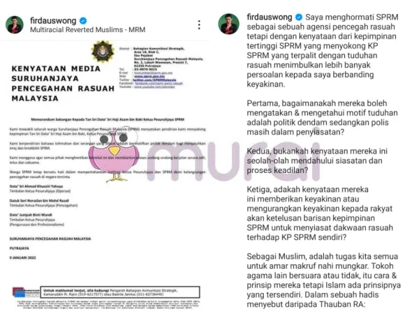 Kenyataan yang dikeluarkan SPRM menarik perhatian pendakwah terkenal tanah air, Firdaus Wong di mana pendakwah ini mempersoalkan beberapa aspek berkaitan Azam Baki dan sekaligus memberi teguran terhadap institusi tersebut di Instagram nya.