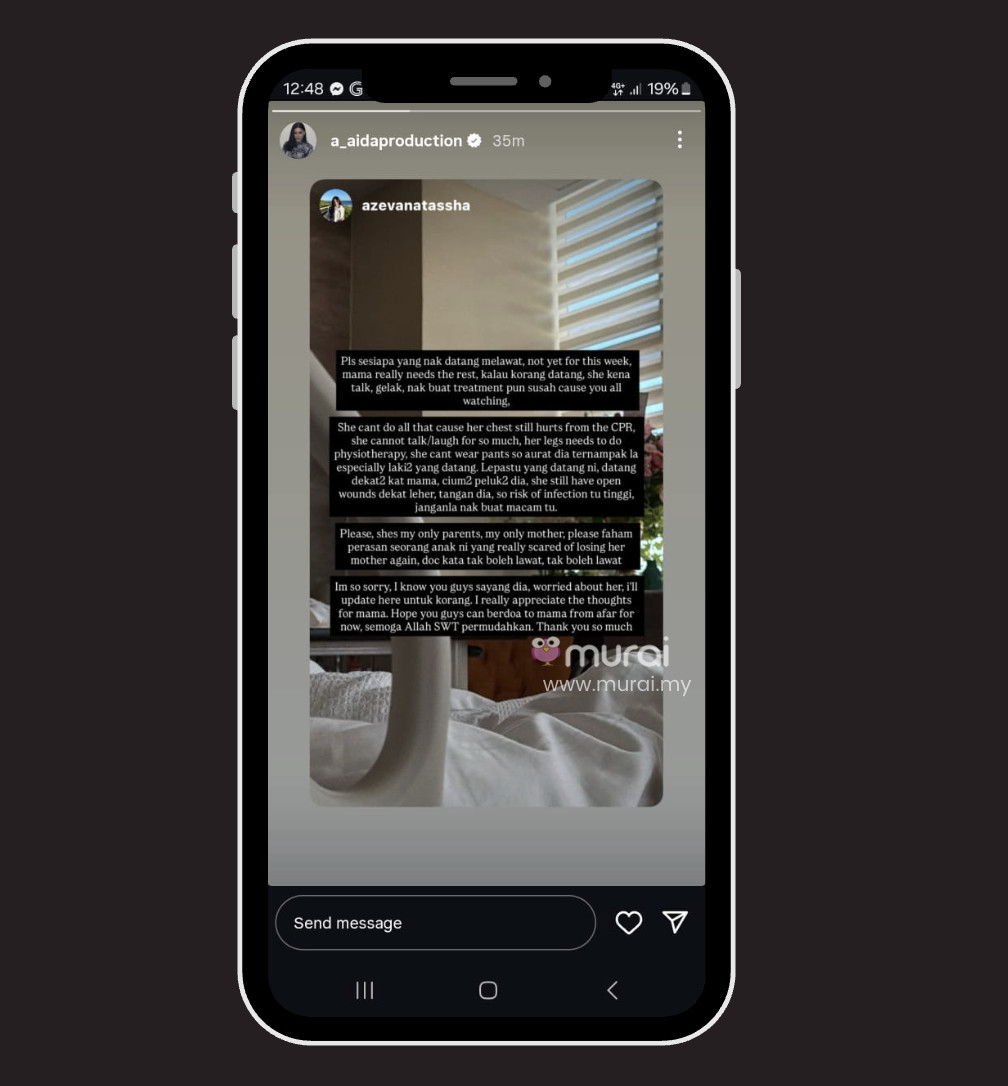 Walaupun risau, nada Azeva kedengaran positif kerana beliau sangat menghargai doa dan keprihatinan ramai terhadap kesihatan A.Aida. Katanya, orang luar tak perlu gusar kerana beliau akan berkongsi perkembangan terkini dari masa ke masa.