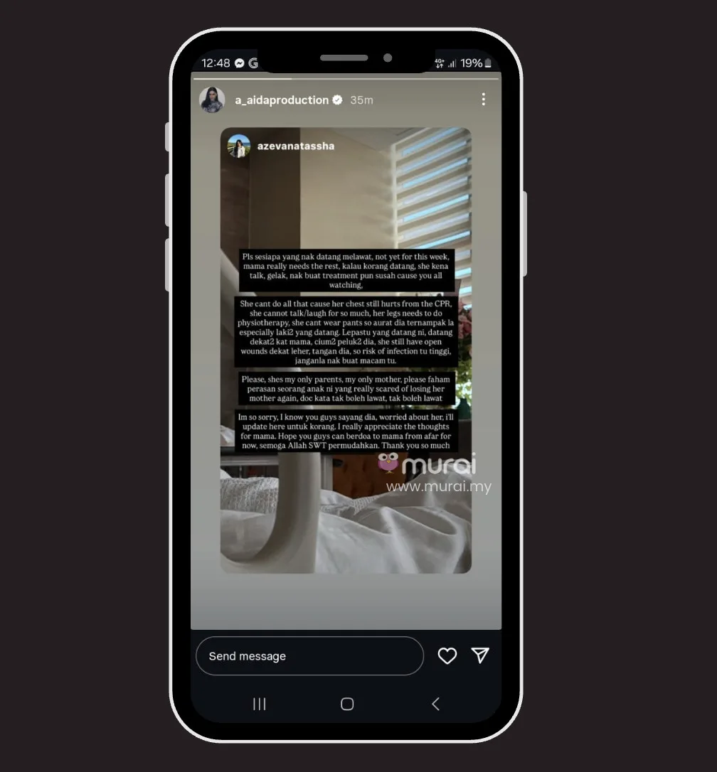 Katanya, buat masa ini Mama perlu banyak berehat. Bila ramai datang melawat, Mama terpaksa bercakap dan ketawa, sedangkan dada beliau masih sakit kesan daripada CPR. Malah, dengan luka yang masih belum pulih sepenuhnya, risiko jangkitan juga boleh meningkat jika ada yang terlalu rapat atau menyentuhnya.