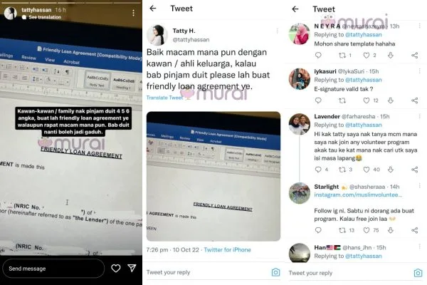 “Baik macam mana pun dengan kawan/ahli keluarga, kalau bab duit tolong lah buat perjanjian mesra pinjaman ya.” Ciapnya di Twitter