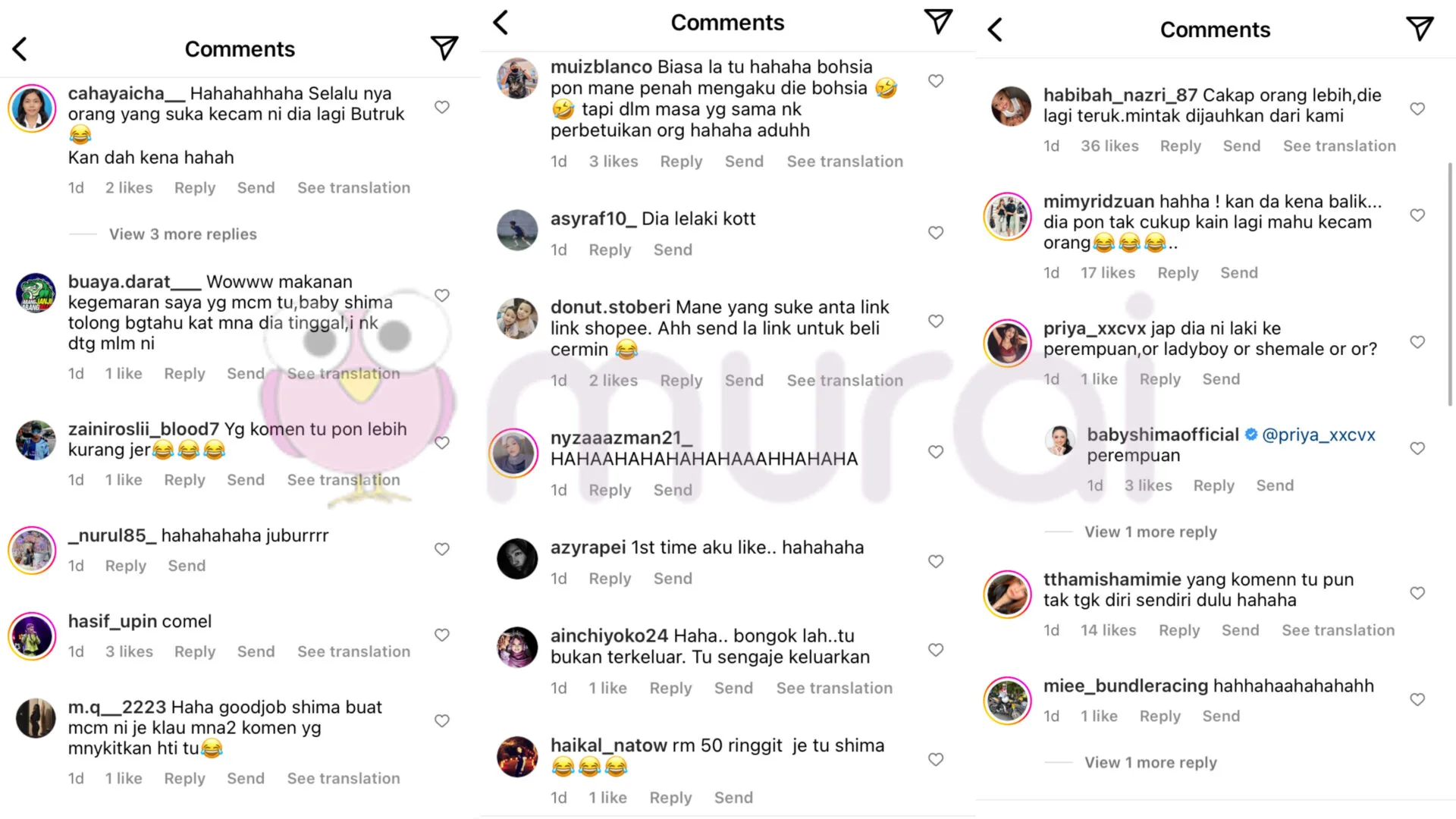 Tinjauan Murai My di ruangan komen mendapati, rata-rata netizen dilihat memberikan sokongan terhadap Baby Shima, malah ada yang turut mempersoalkan jantina sebenar netizen wanita tersebut.