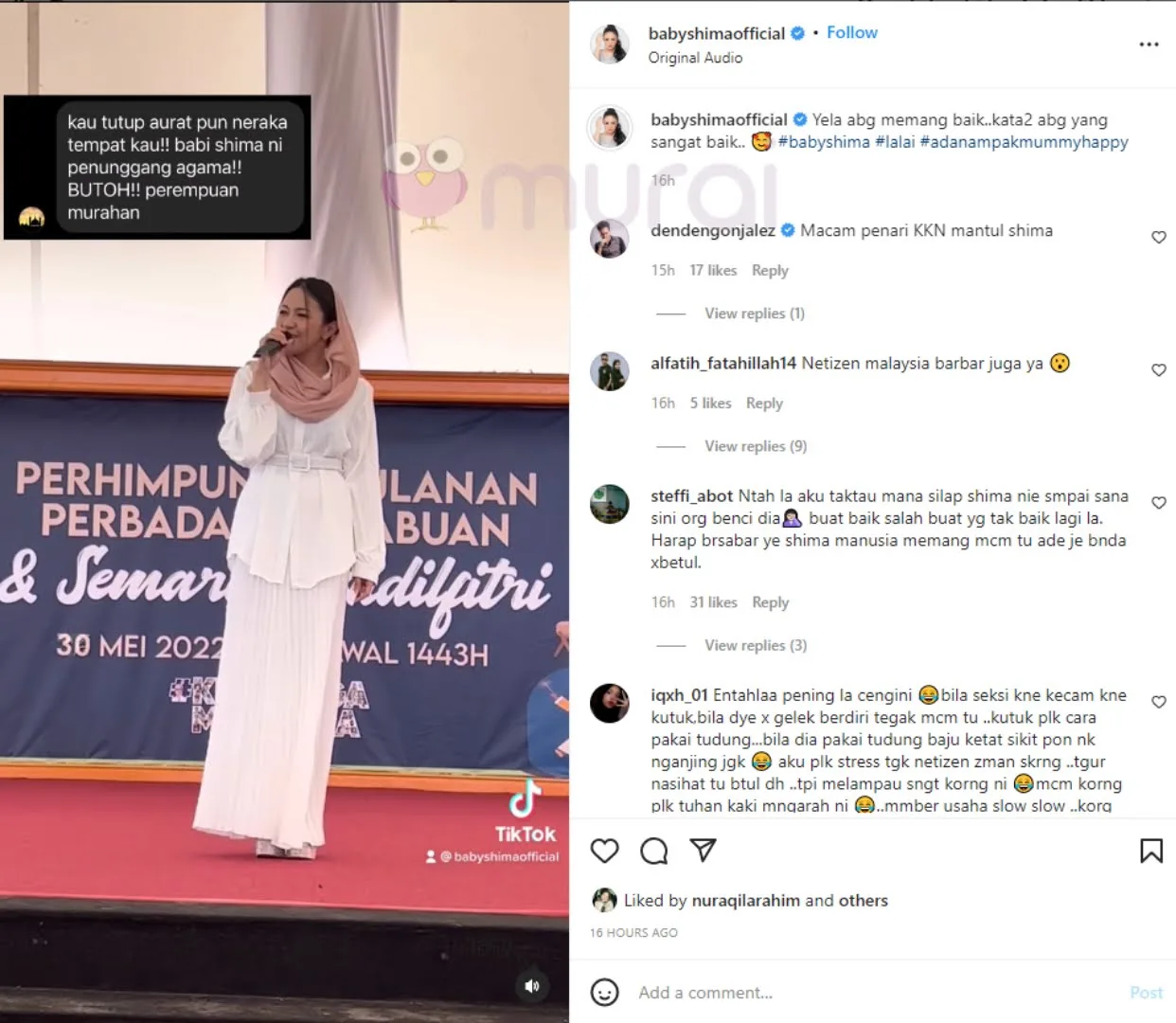 Menerusi Instagram Baby Shima dilihat berkongsi DM seorang netizen yang menggelarnya sebagai penunggang agama dan perempuan murahan, serta menganggap Baby Shima tetap masuk ke neraka walaupun menutup aurat.