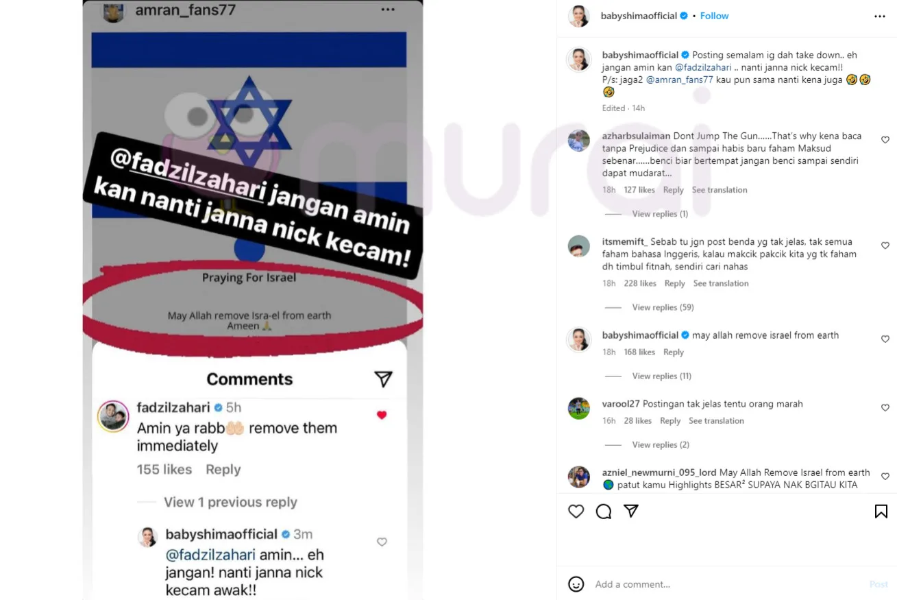 Menerusi posting yang telah dipadam oleh Instagram, Baby Shima dilihat memuatnaik foto bendera Israel bersama kapsyen zaiz halus yang mendoakan agar Israel dibuang dari Bumi.