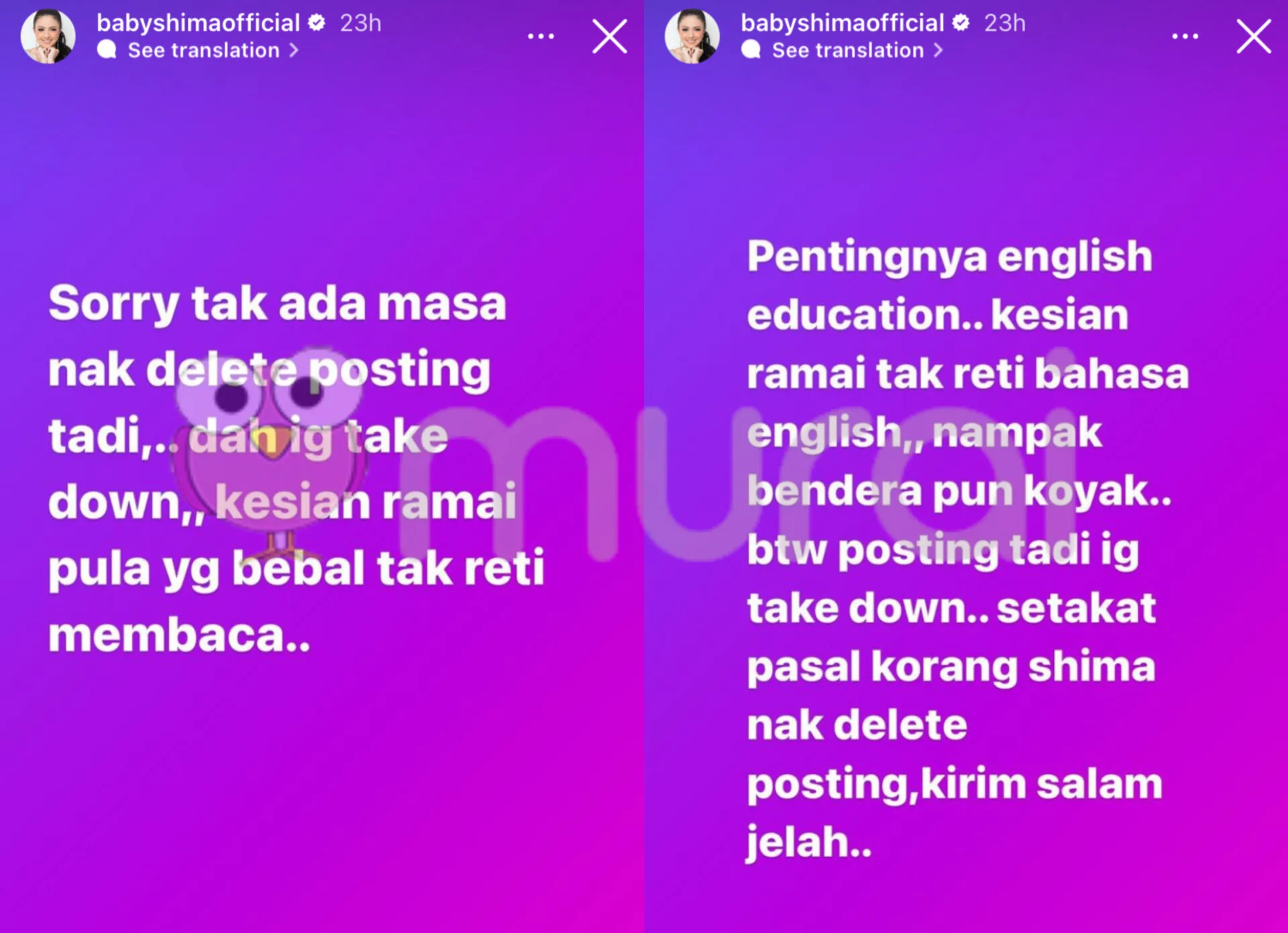 Pentingnya English education. Kesian ramai tak reti bahasa English. Nampak bendera pun koyak.. Btw posting tadi IG take down. Setakat pasal korang Shima nak delete posting, kirim salam je lah.”-tulis Baby Shima