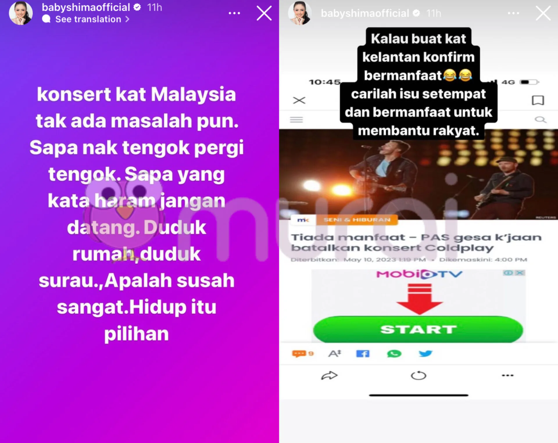 Isu berkenaan turut mendapat reaksi oleh penyanyi dangdut sensasi, Baby Shima menerusi Insta Stories yang menyuarakan pendapatnya bahawa penganjuran konsert di Malaysia bukanlah menjadi satu masalah serta ‘menyelar’ pihak terlibat untuk hanya duduk di rumah dan surau jika menyifatkan konsert berkenaan sebagai haram.
