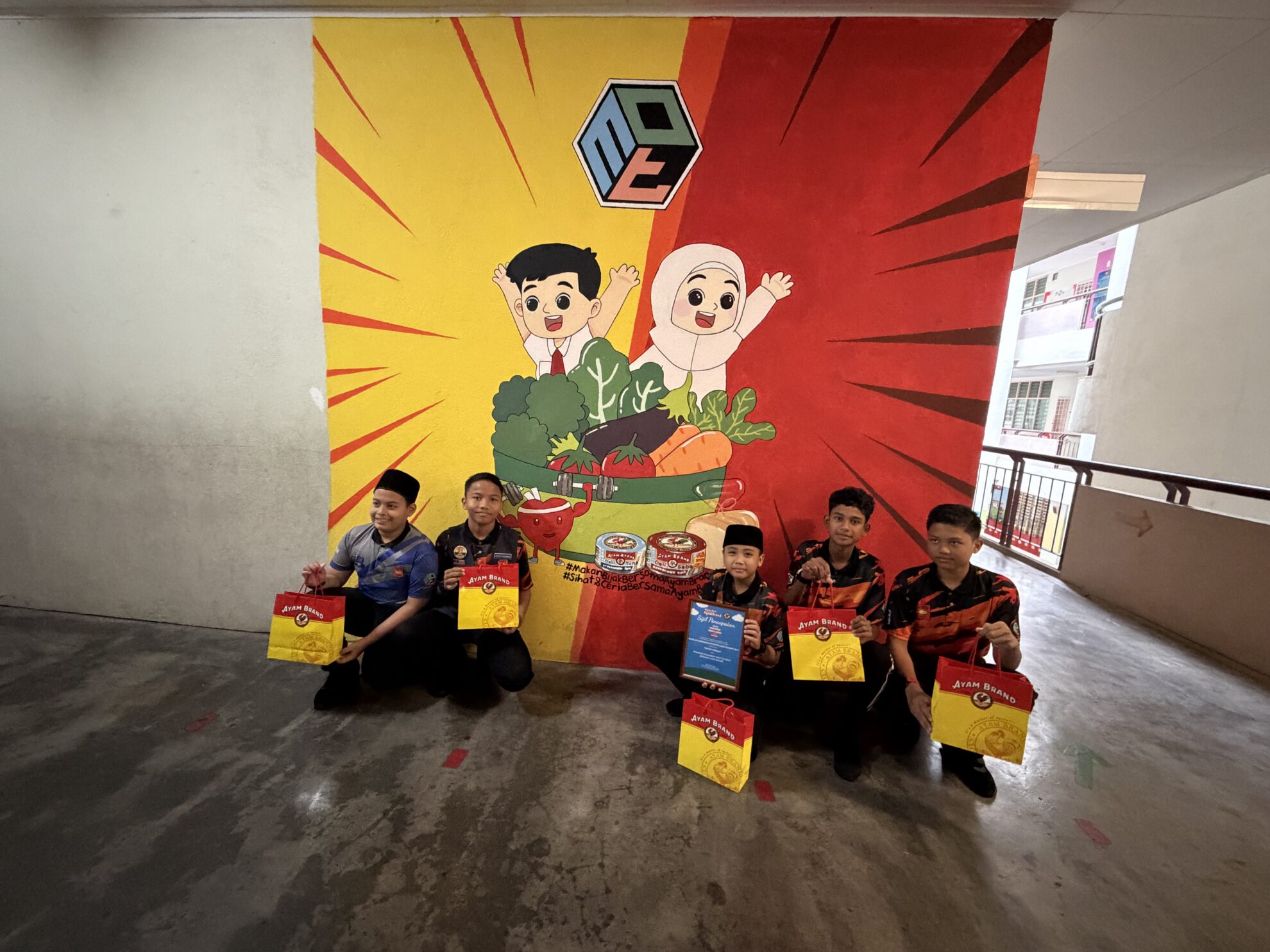 Pertandingan Mural Antara Sekolah: 30 pasukan ubah dinding sekolah jadi mural ceria penuh mesej gaya hidup sihat dan kerjasama. Mural dinilai dari kreativiti, mesej, dan penggunaan media sosial (#Sihat&CeriaBersamaAyamBrand).