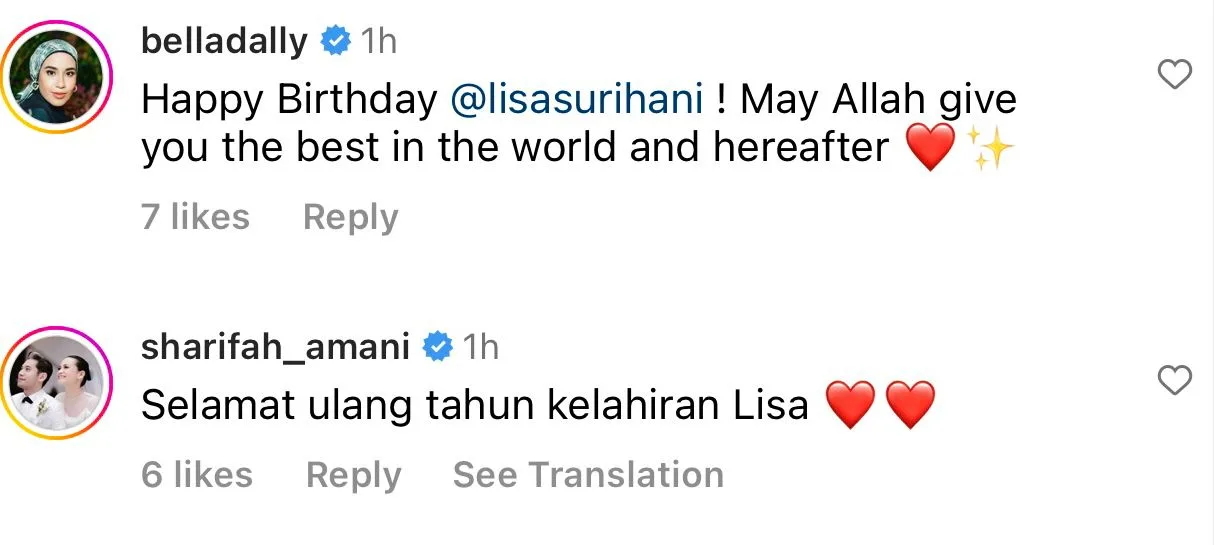 Menjengah ke ruangan komen, rata-rata rakan selebriti juga turut menitipkan doa dan mengucapkan Selamat Hari Jadi buat Lisa.
