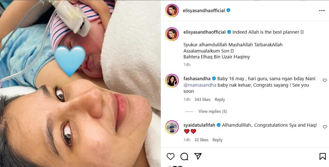 Pelakon popular, Elisya Sandha, berkongsi berita gembira apabila beliau selamat melahirkan cahaya mata kedua, seorang bayi lelaki yang dinamakan Bahtera Elhaq Bin Uzair Haqimy.