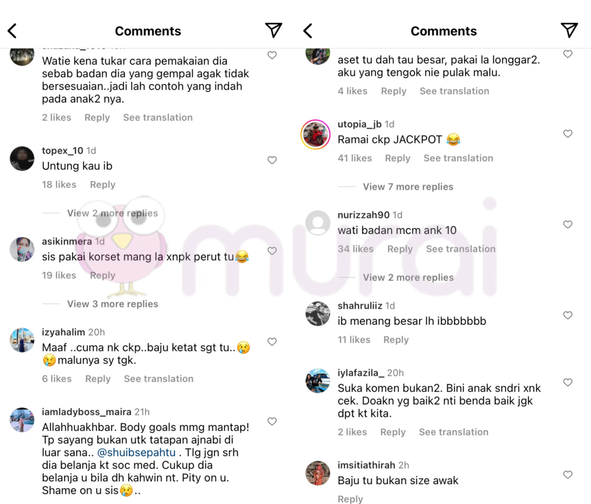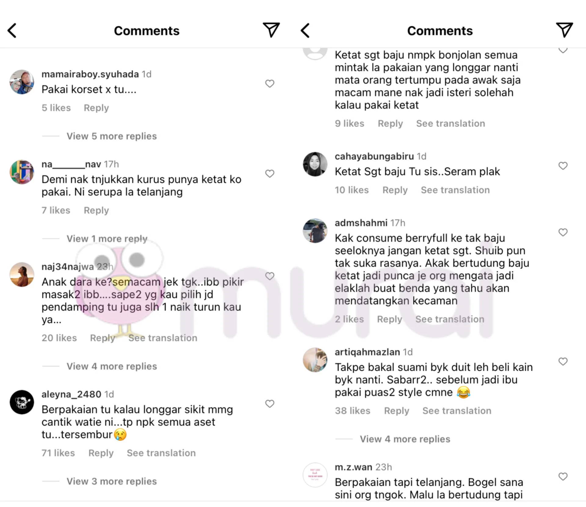 Tinjauan Murai MY di ruangan komen mendapati, rata-rata netizen memberikan teguran kepada Watie yang dilihat memakai busana ketat sehingga menampakkan sosok tubuh badannya itu.