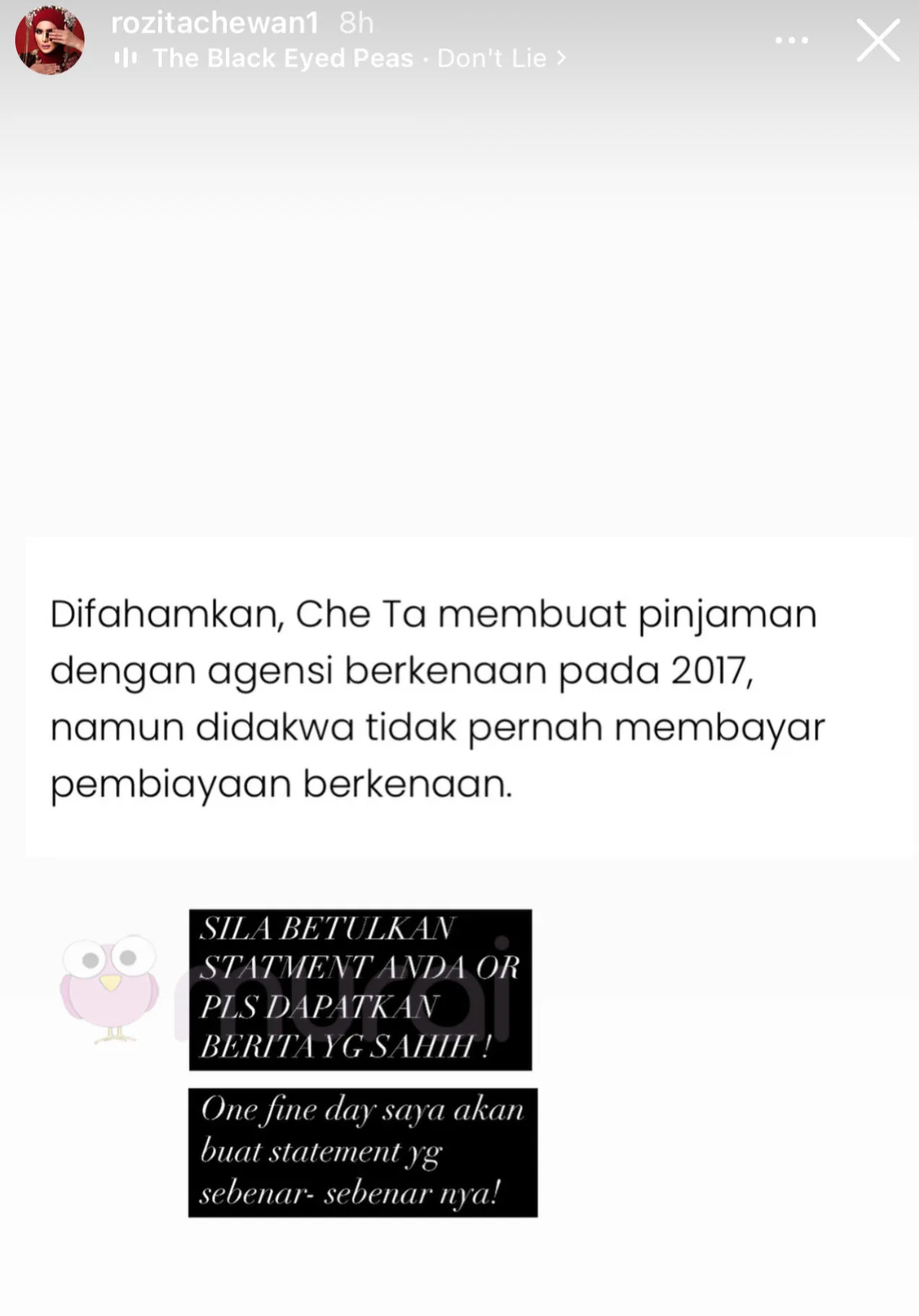 Dalam pada itu, Rozita Che Wan atau lebih mesra disapa sebagai Che Ta menerusi hantaran di Insta Stories, dilihat memberikan teguran terhadap keratan artikel mengenainya yang dikatakan tidak pernah membayar pinjaman yang dibuat pada 2017.