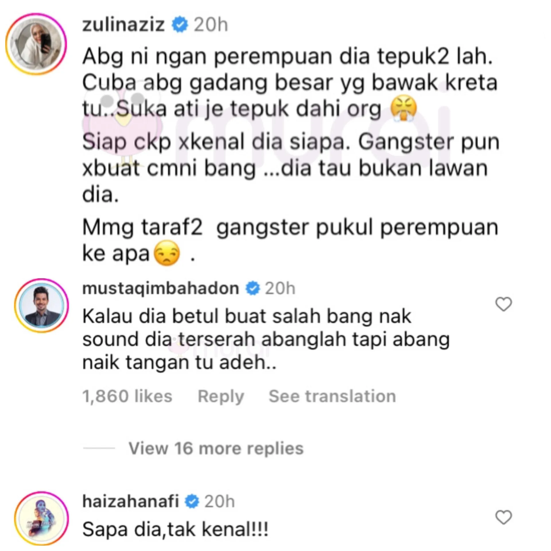 “Abang ni ngan perempuan dia tepuk-tepuk lah. Cuba abang gadang besar yang bawak kereta tu. Suka hati je tepuk dahi orang. Siap cakap tak kenal dia siapa. Gangster pun tak buat macam ni bang. Dia tau bukan lawan dia. Memang taraf-taraf gangster pukul perempuan ke apa.”-Zuliz Aziz