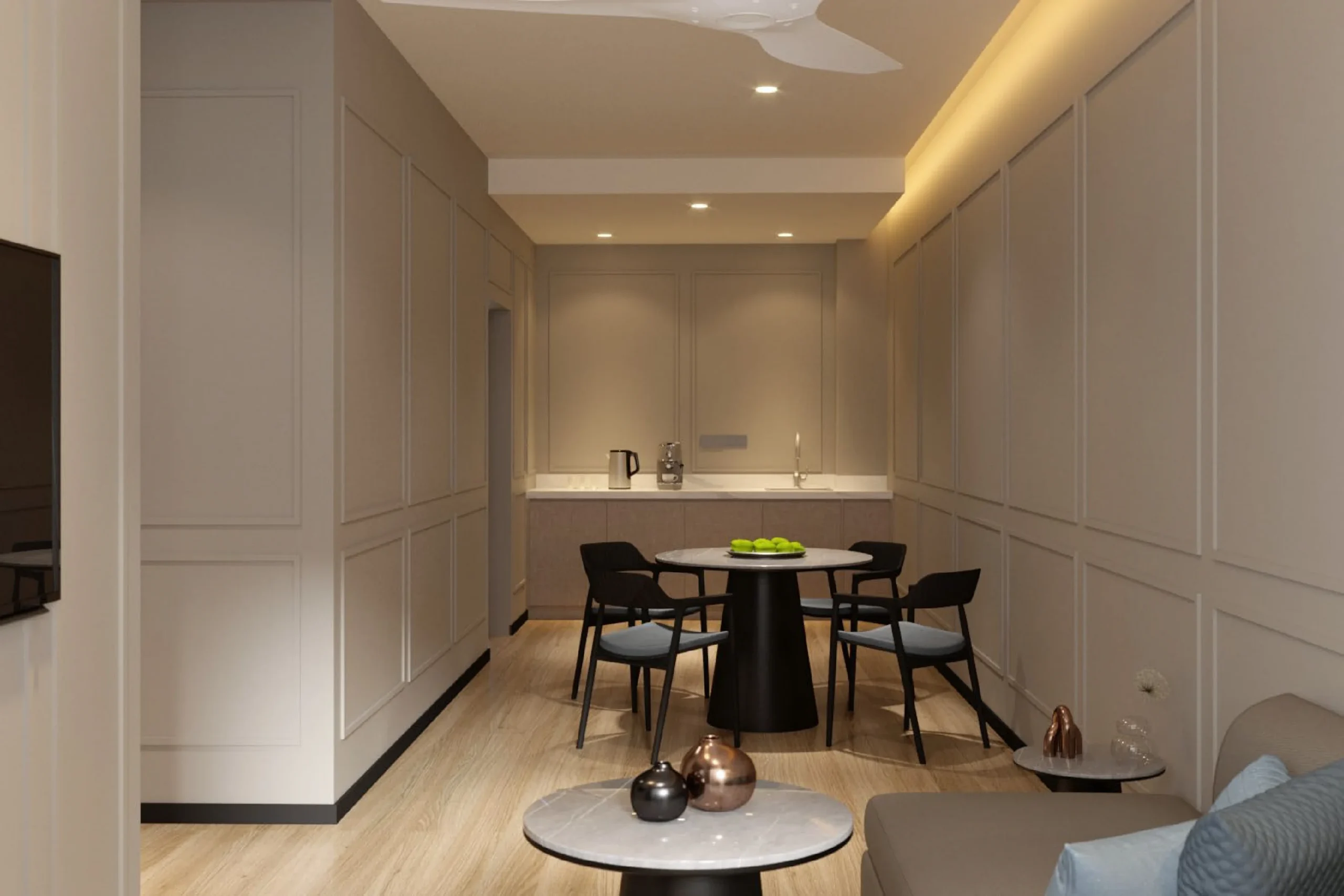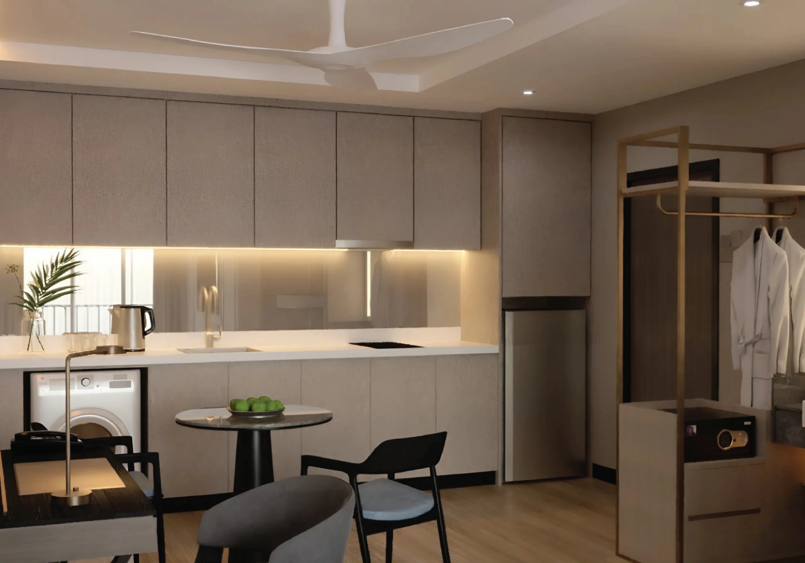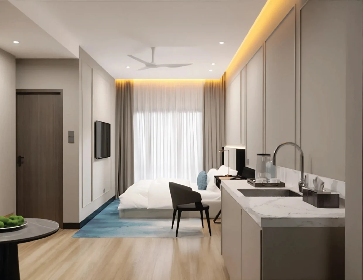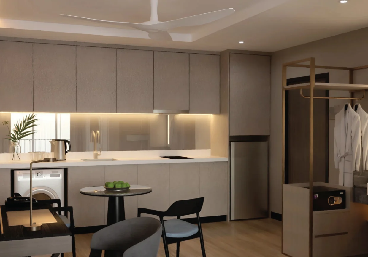 Tak perlu risau nak cari gym, laundry, WiFi, atau housekeeping, semua ada. Bilik mandi lengkap dengan pengering rambut, dispenser air bertapis, seterika wap, dan dapur lengkap sesuai untuk stay jangka panjang.