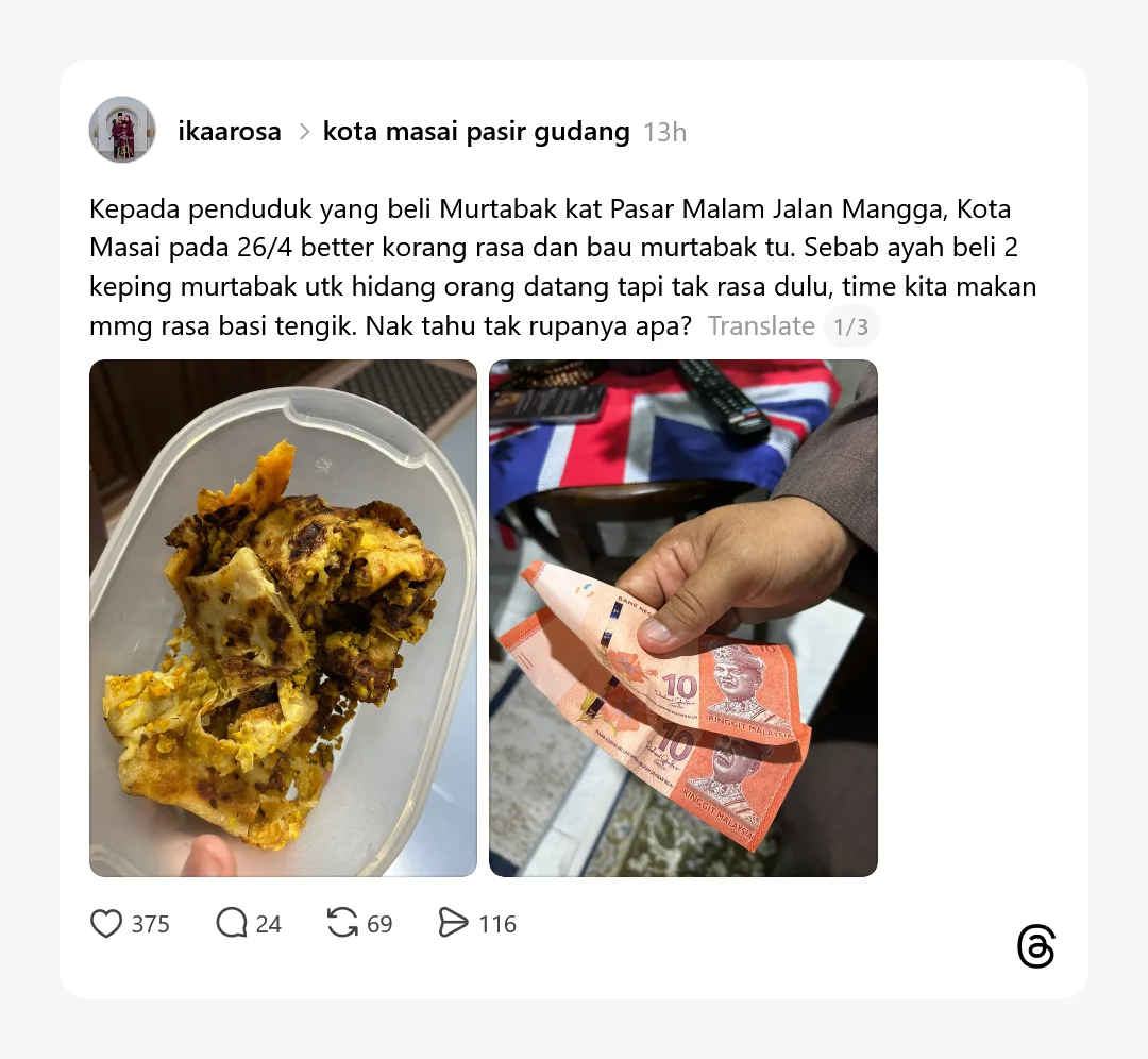 Menurut individu di Thread tersebut, murtabak berkenaan dibeli oleh bapanya untuk dihidangkan kepada tetamu yang datang ke rumah.