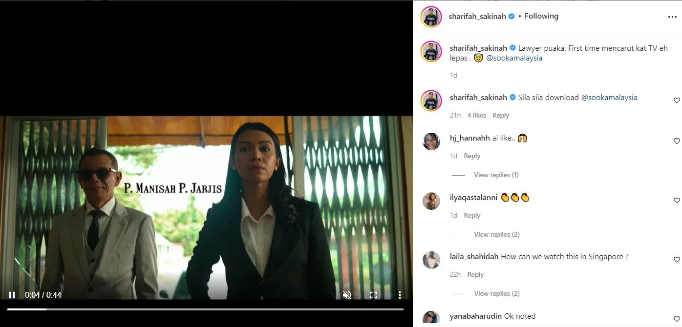 Dalam video yang dimuat naik oleh Sakinah, dia menunjukkan potongan klip lakonannya di dalam salah satu episod drama Hantu Raya Pergi Perang.