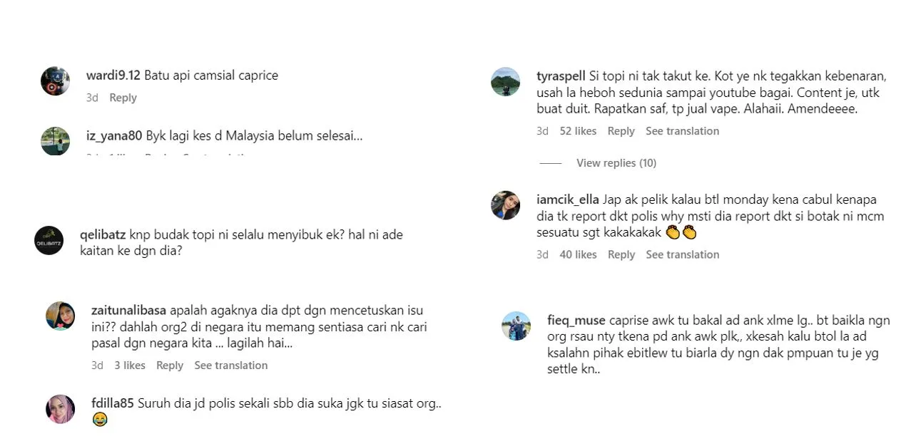 Di ruangan komen netizen mempersoalkan keterlibatan Caprice, malah ada yang meminta untuk Caprice tukar kerjaya menjadi polis kerana dia dilihat suka menyiasat hal-hal orang lain.