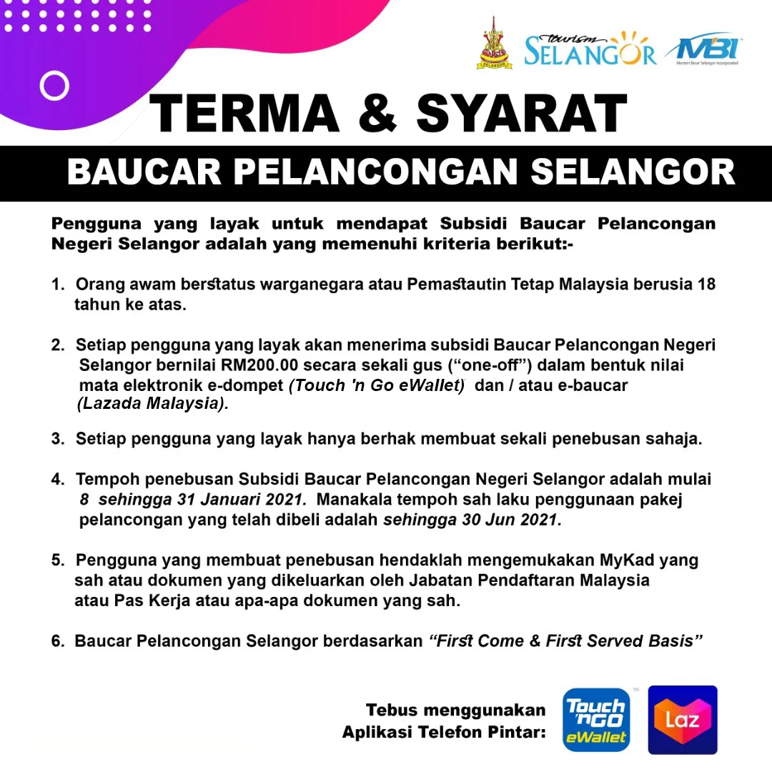 Penebusan baucar tersebut telah bermula pada 8 Januari hingga 31 Januari 2021 di aplikasi dompet elektronik Touch ‘n Go e-Wallet dan aplikasi ‘marketplace’ Lazada Malaysia melalui capaian khas pautan sesawang mikro ‘Kempen Nak Bercuti? Pusing Selangor Dulu!’ dan pengguna boleh membeli pakej yang ditawarkan sehingga 30 Jun 2021.