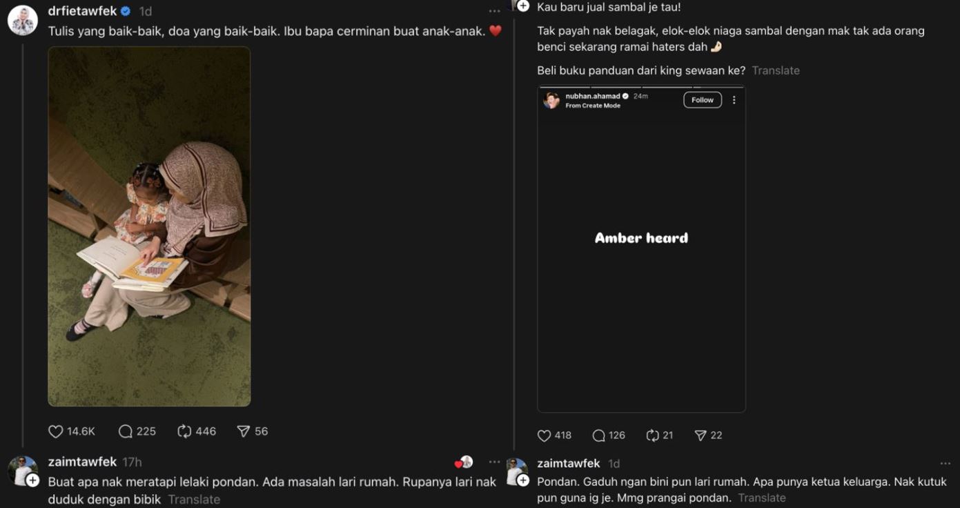 Melalui platform Threads, Zaim meninggalkan komen yang cukup pedas kepada Nubhan yang sedang menghadapi masalah rumah tangga.