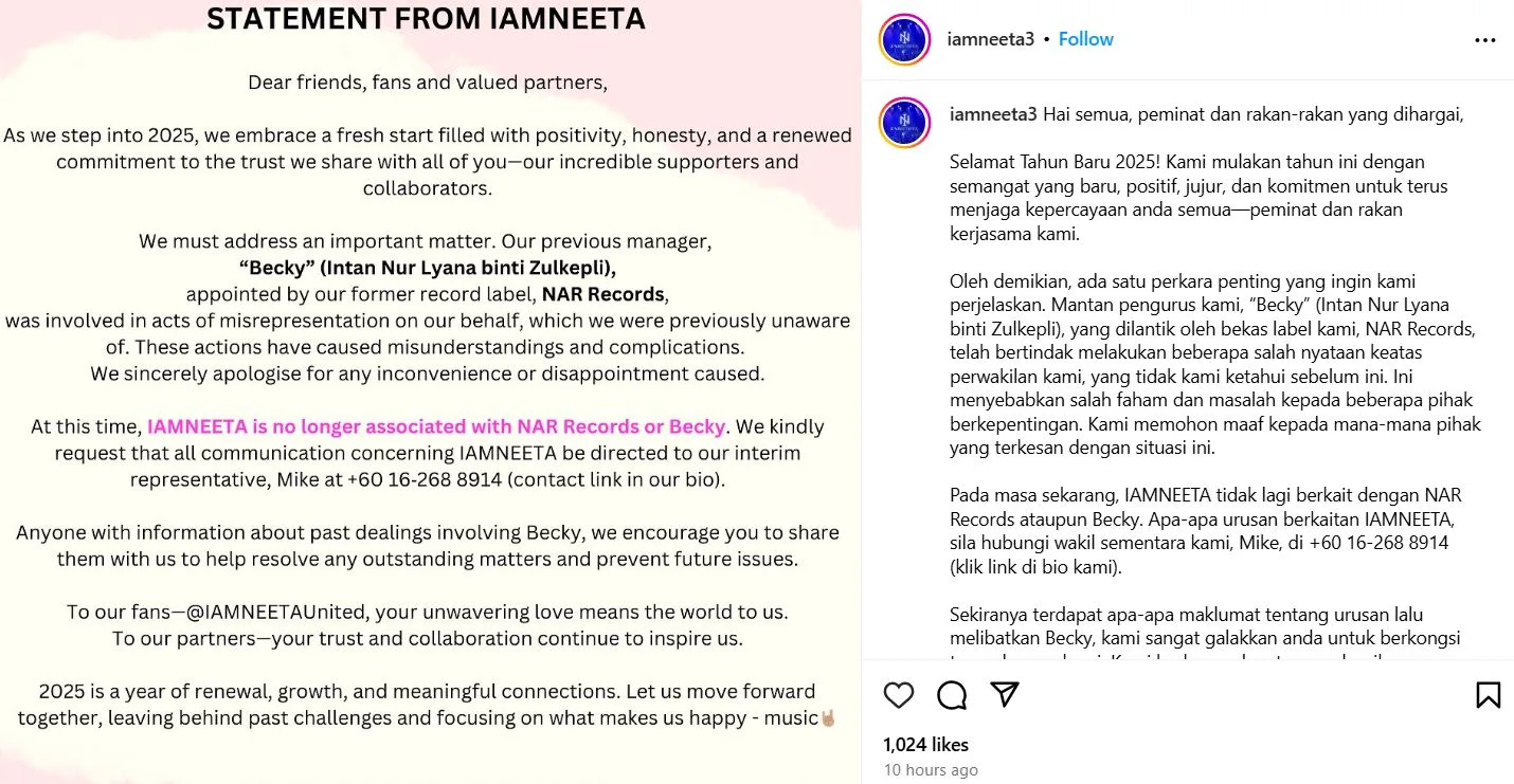 Becky juga menegaskan bahawa setelah Ogos 2024, dia tidak lagi menguruskan IAmNeeta dan kali terakhir dia menguruskan band tersebut adalah pada Jun 2024.