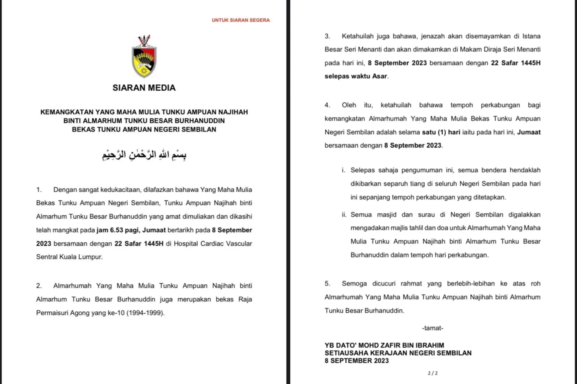 Semua masjid dan surau digalakkan mengadakan majlis tahlil dan doa untuk Almarhumah Yang Maha Mulia Tunku Ampuan Najihah binti Almarhum Tunku Besar Burhanuddin dalam tempoh hari perkabungan.”- Kenyataan SUK Negeri Sembilan