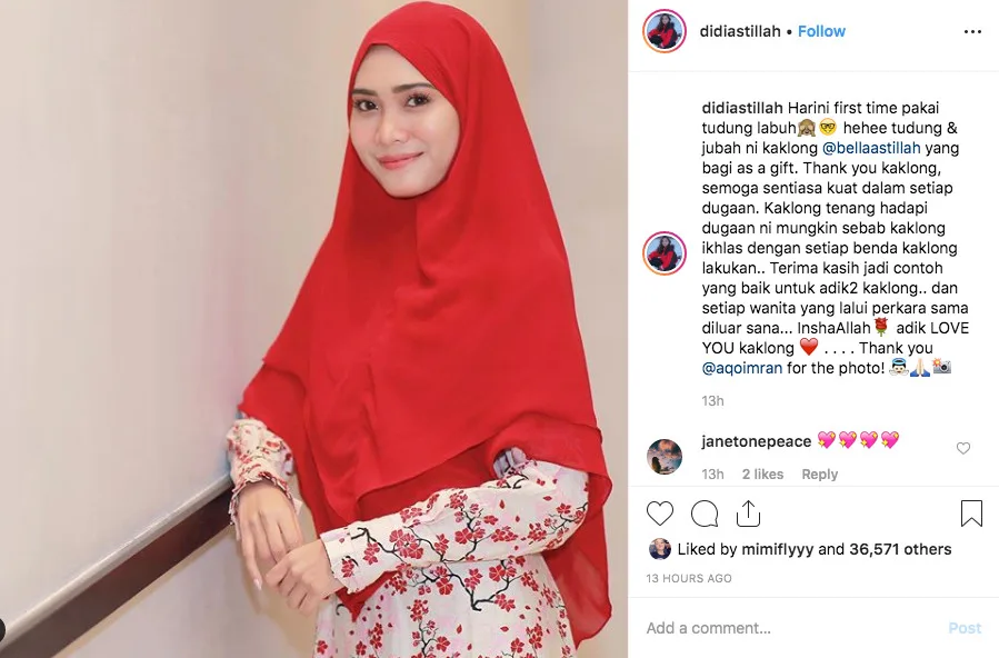 Dalam perkembangan lain, perhatian turut tertumpu pada posting yang dimuat naik oleh adik Bella, Didi Astillah. Didi yang juga seorang pelakon dan penyanyi kelihatan begitu ayu memakai jubah dan tudung labuh berwarna merah dimana menurutnya pakaian itu telah diberikan oleh Bella sendiri sebagai hadiah.