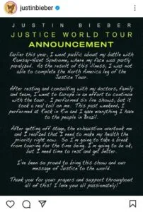 Sekadar info, Justin menghidap Sindrom Ramsay-ylunt, dimana sebahagian wajahnya mengalami lumpuh. Sebelum ini, perancangan konsert jelajahnya terjejas disebabkan gangguan penyakit sama.