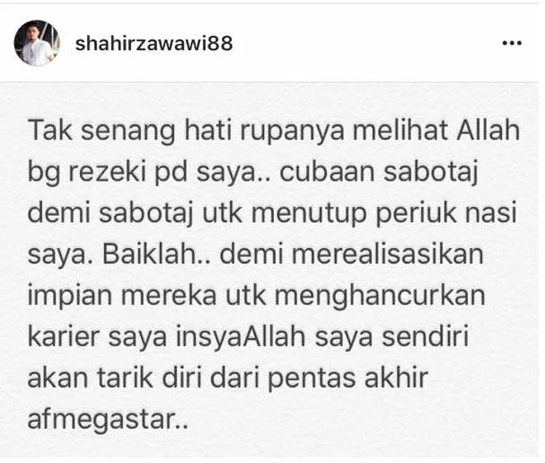 Dek kerana kontroversi yang tercetus, Shahir melalui Instagram nya telah membuat keputusan untuk menarik diri dari pentas akhir AF Megastar namu melupakan hasratnya itu apabila memikirkan sokongan dari peminatnya yang tidak berbelah bahagi sejak terpilih ke AF Megastar
