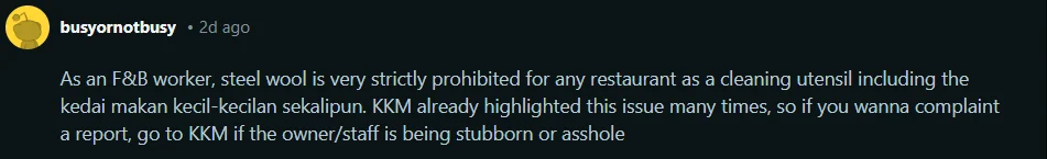 “Sebagai pekerja F&B, steel wool memang strictly prohibited, walaupun di kedai kecil,” kongsi seorang netizen.