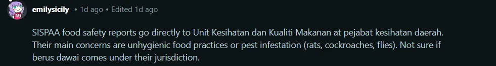 - SISPAA, sistem aduan rasmi yang disalurkan ke Unit Kesihatan dan Kualiti Makanan di pejabat kesihatan daerah