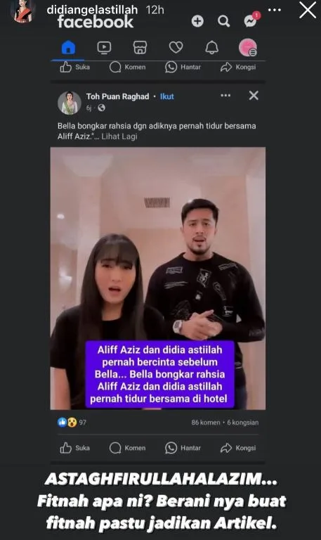 Kenyataan tersebut dibuat selepas sebuah akaun Facebook memuat naik artikel dengan tajuk sensasi yang mengaitkan Didi dan Aliff dalam hubungan yang tidak wajar.