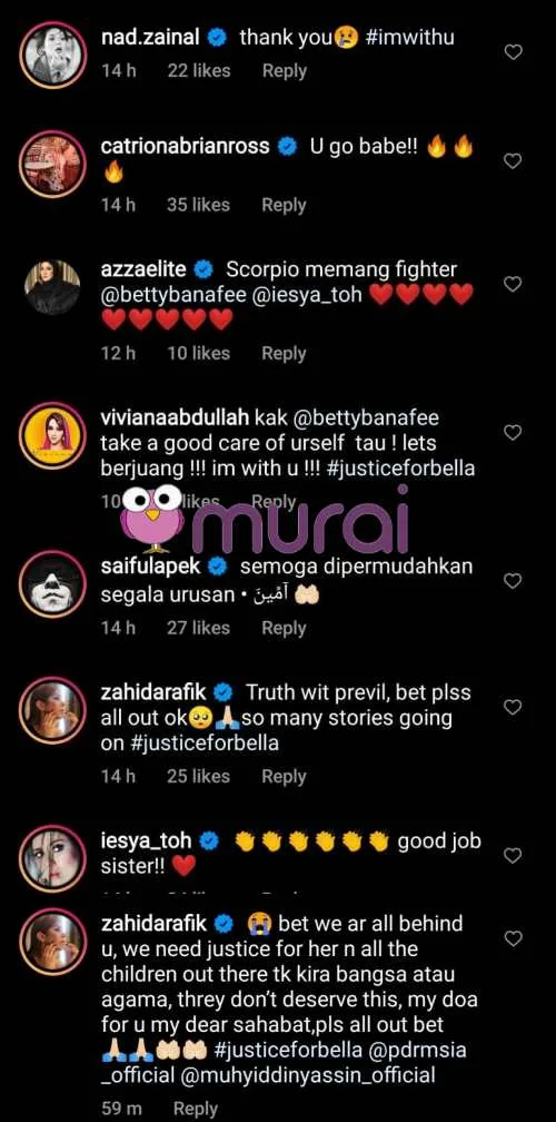 Menjengah ke ruangan komen,pengikut Betty dan rakan-rakan selebriti seperti Zoey Rahman,Zahida Rafik, Catriona Ross, Azza Elite, Nad Zainal serta ramai lagi mengagumi akan semangatnya untuk menegakkan keadilan buat adik Bella.