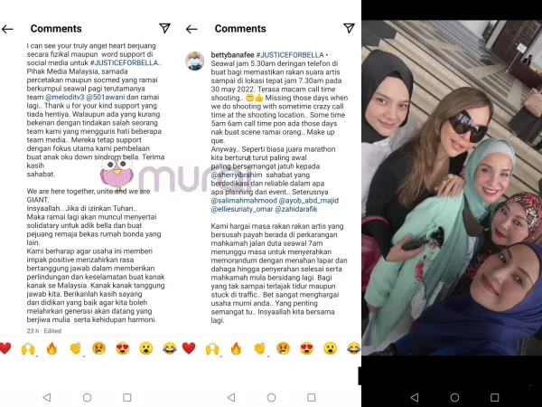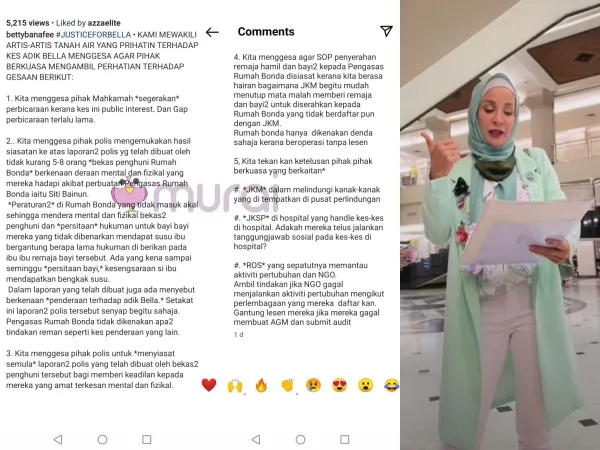 Pelakon Betty Banafe menerusi di laman Instagram semalam berkongsi tentang usaha penggiat seni tempatan dalam menyuarakan isu keadilan buat adik Bella, remaja istimewa sindrom down (OKU) yang didera di pusat penjagaan pertubuhan bukan kerajaan (NGO) yang dikenali sebagai Rumah Bonda.