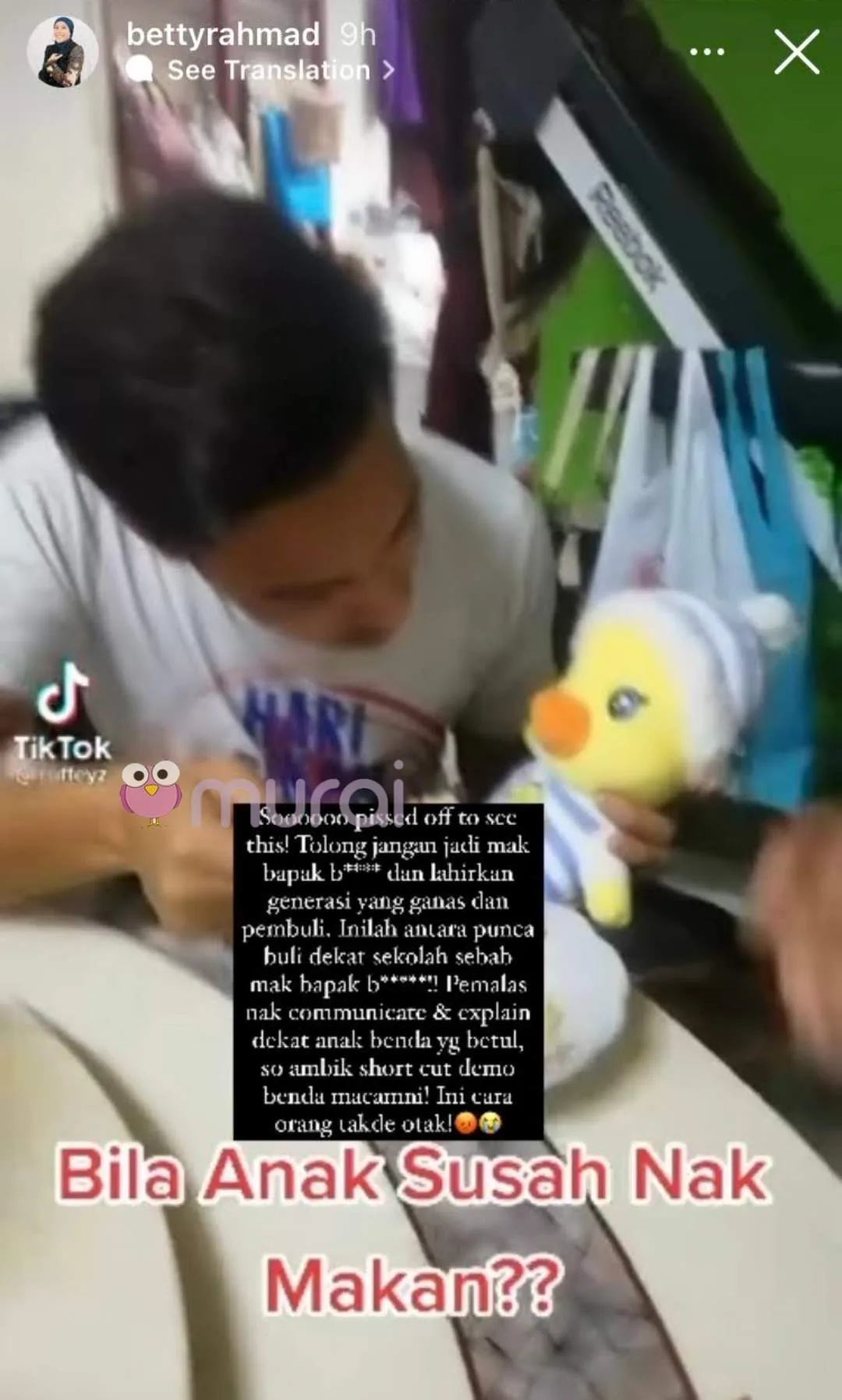 Pelakon dan usahawan terkenal, Betty Rahmad meluahkan rasa berang terhadap sebuah video yang tular di aplikasi TikTok yang memaparkan seorang lelaki memukul anak patung di hadapan anaknya untuk memastikan kanak-kanak itu makan.