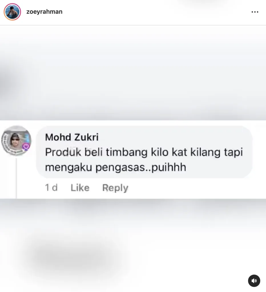 “Produk beli timbang kilo kat kilang tapi mengaku pengasas.. puihh”- komen dari pemilik akaun bernama Mohd Zukri