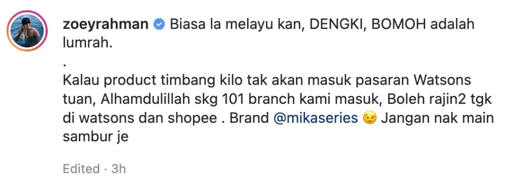“Biasa la melayu kan, DENGKI, BOMOH adalah lumrah. Kalau product timbang kilo tak akan masuk pasaran Watsons tuan, Alhamdulillah skg 101 branch kami masuk, Boleh rajin2 tgk di watsons dan shopee . Brand @mikaseries . Jangan nak main sambur je” tulisnya di Instagram.