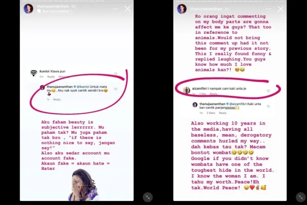 Berkongsi di Instagram, Thanuja telah memuat naik dua komen individu yang membuli fizikalnya. Akuinya, dia tidak terkesan apabila diberikan komen sebegitu.