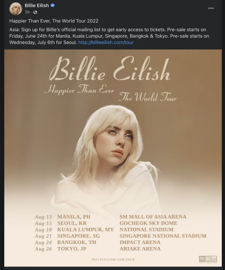 Mengambil halaman Facebook rasminya, pasukannya mengumumkan persinggahan Asia dalam Jelajah Dunia 2022 berjudul Happier Than Ever, The World Tour 2022. Mereka menulis,