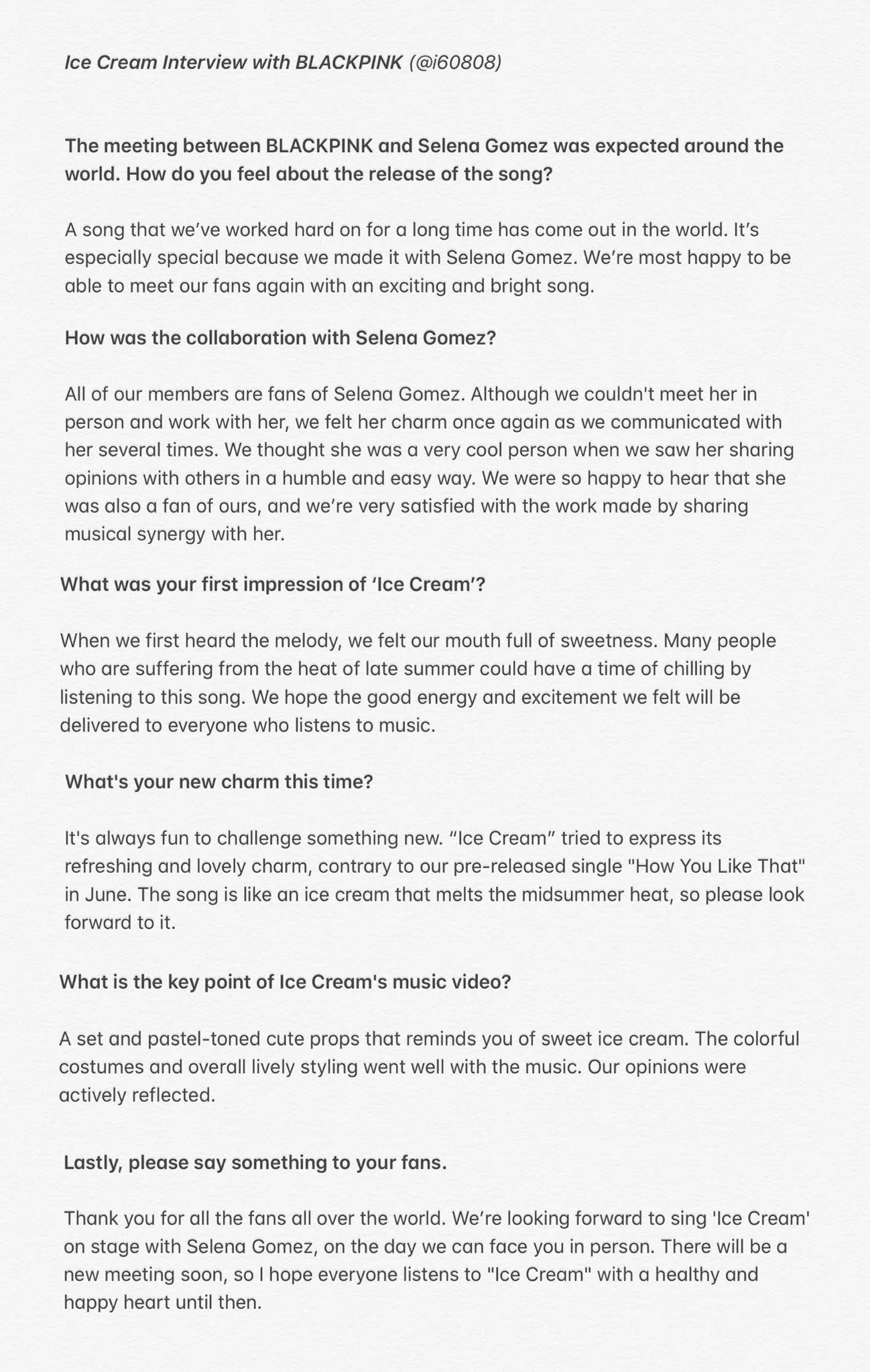 Bercakap mengenai kolaborasi tersebut, Blackpink yang dianggotai oleh Lisa,Jennie, Rose dan Jisoo itu begitu teruja dapat menghasilkan single ini apatah lagi berduet dengan Selena yang merupakan penyanyi kegemaran mereka. Berikut Murai.my tampilkan temubual penuh Blackpink mengenai Ice Cream seperti yang dipetik menerusi News Raver.com.