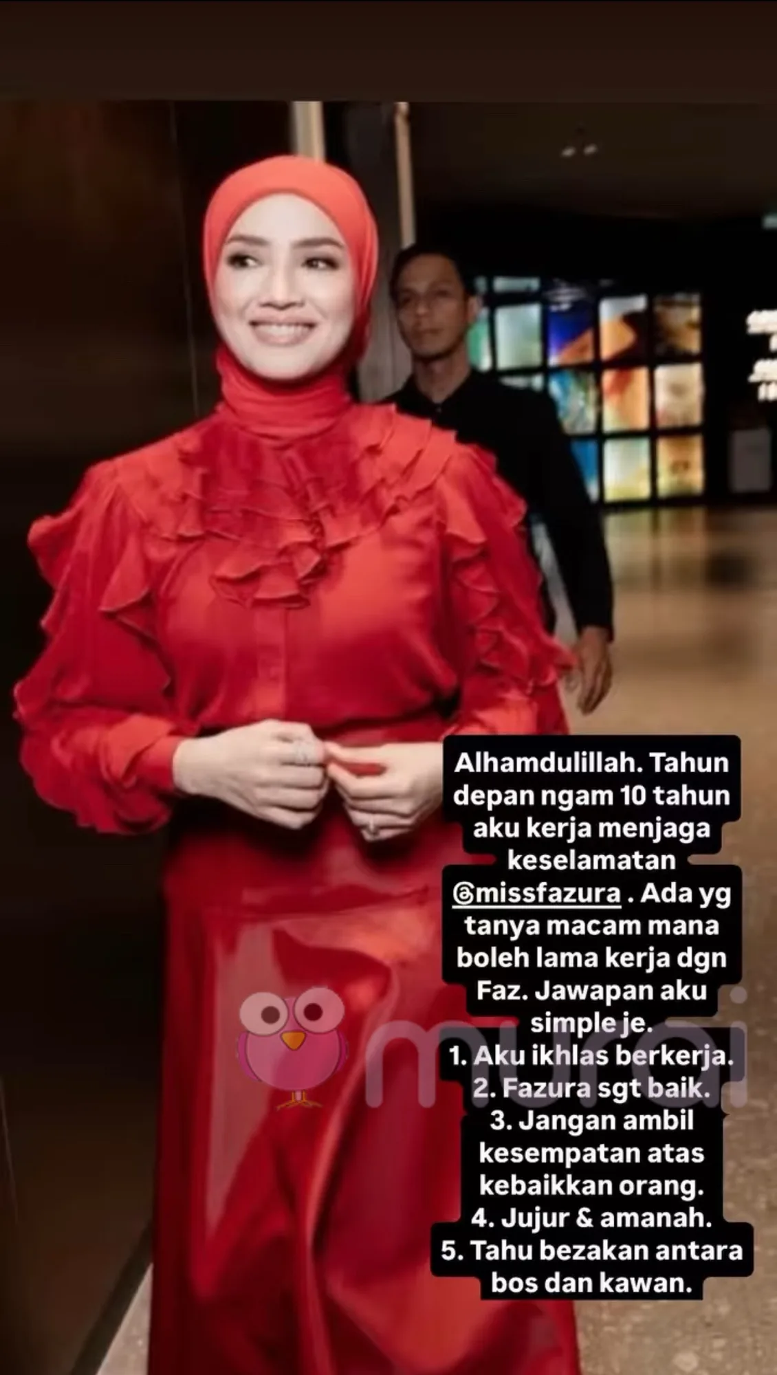 “Alhamdulillah tahun depan ngam 10 tahun aku bekerja menjaga keselamatan Fazura. Ada yang tanga macam mana boleh lama kerja dengan Faz.