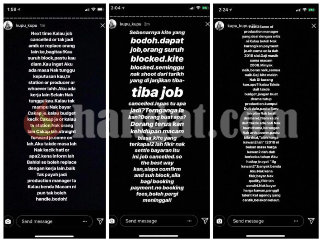 “Sudah berbelas tahun saya terpaksa berdepan ayat yang sama. Sebagai pelakon, banyak perkara yang perlu saya fikir. Bayar dan saya akan berikan hasil kerja berkualiti kerja. Fikirlah sendiri.