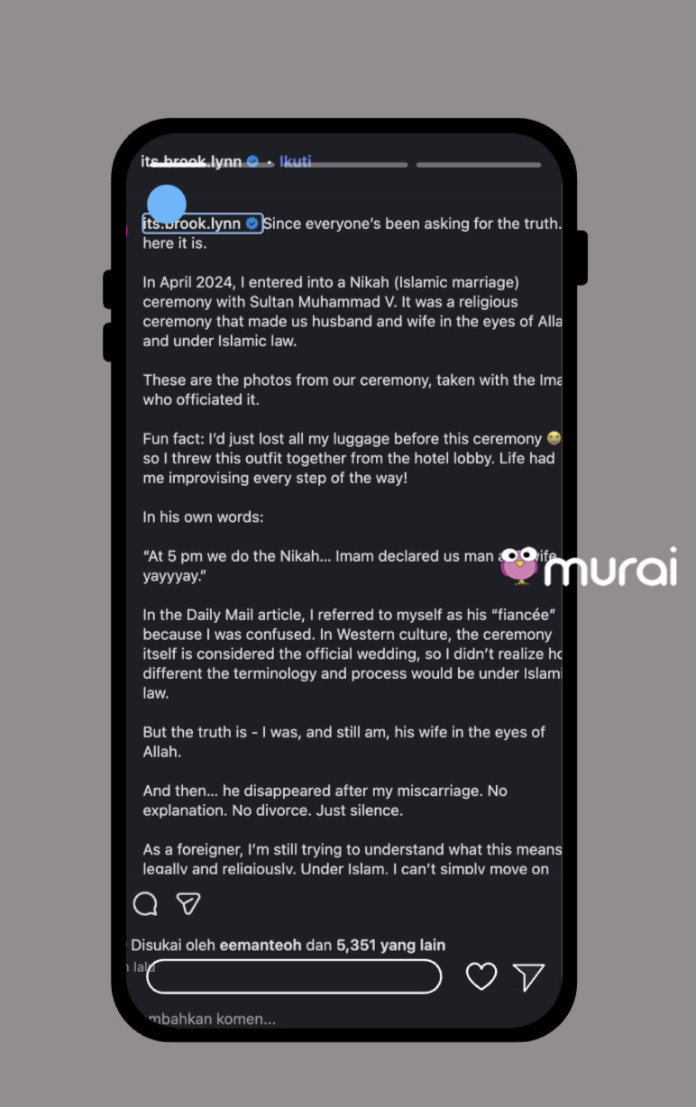 Dalam hantaran panjang yang dikongsi, Brook akhirnya mengaku bahawa dia pernah melalui upacara nikah secara Islam dengan kerabat berkenaan pada April 2024, dan menyifatkan perkahwinan itu sah di sisi agama.