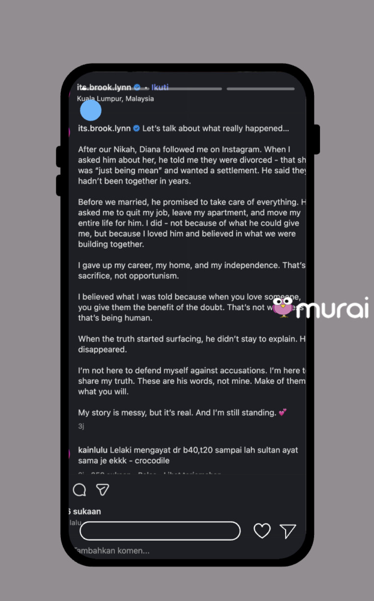 Kisah penuh teka-teki antara wanita warga asing, Brook Lyn, dan seorang kerabat diraja di Malaysia kembali jadi bualan hangat selepas Brook sendiri tampil menceritakan sisi sebenar kehidupannya di Instagram.