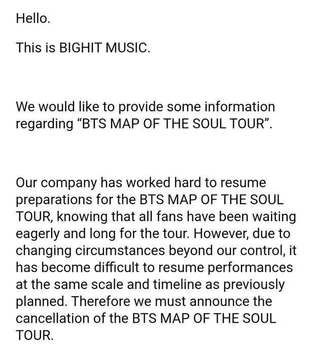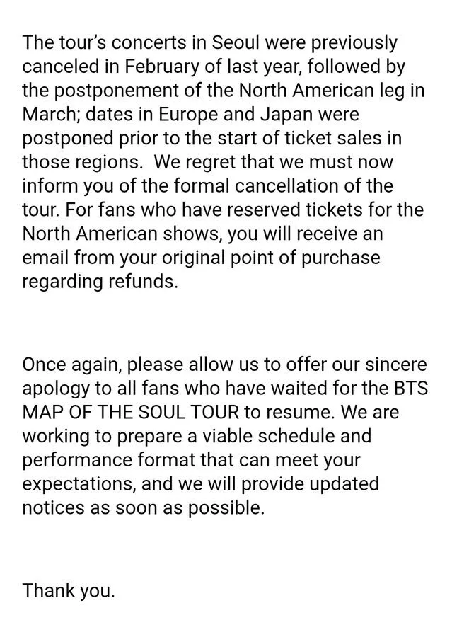 Oleh itu, kami terpaksa mengumumkan pembatalan BTS MAP OF THE SOUL TOUR.”-Agensi