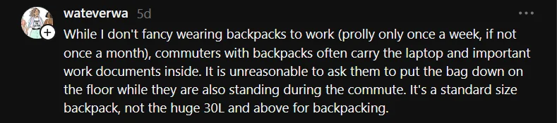 Namun, terdapat juga pandangan balas yang menyatakan tidak semua pengguna selesa meletakkan beg di lantai, apatah lagi jika membawa barangan penting seperti komputer riba atau dokumen kerja.