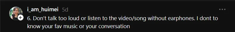 Bukan itu sahaja, tindakan seperti bercakap terlalu kuat, memainkan muzik tanpa fon telinga, serta berdiri terlalu dekat hingga menimbulkan rasa tidak selesa turut dibangkitkan.