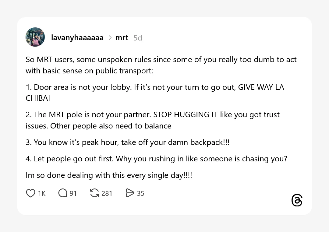 Ada juga yang menyentuh tentang cara berdiri dalam kenderaan, termasuk keperluan untuk menghadap arah tertentu bagi mengelakkan situasi janggal seperti ‘bertentang mata’ secara tidak sengaja.
