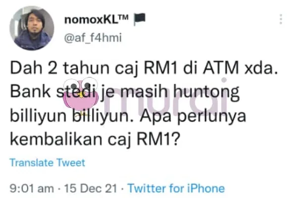 “Dah 2 tahun caj RM1 di ATM tak ada. Bank steady je masih untung bilion bilion. Apa perlunya kembalikan caj RM?” Ciap @af_f4hmi