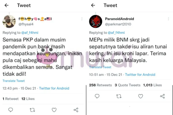 “Semasa PKP dalam musim pandemik pun bank masih mendapatkan keuntungan, inikan pula caj sebegini mahu dikembalikan semula. Sangat tidak adil!” Ciap @fhysal4