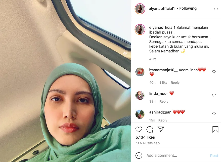 Penyanyi dan pelakon Elyana juga terlihat mengenakan hijab ketika menyambut hari pertama bulan Ramadan. Elyana atau nama sebenarnya Erneelya Elyana Emrizal kini menjalani rawatan untuk kanser limfoma Peringkat 4. Dalam muatnaik foto dengan mengenakan tudung berwarna hijau terang, Elyana memohon doa dari pengikutnya untuk terus kuat berpuasa.